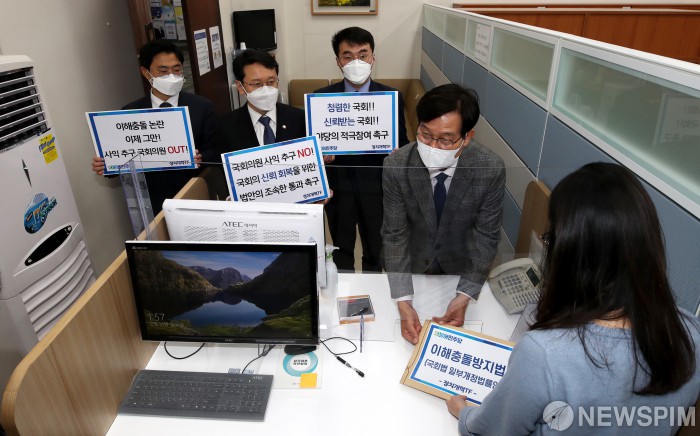 [서울=뉴스핌] 최상수 기자 = 신동근 단장을 비롯한 더불어민주당 정치개혁 TF가 21일 오후 국회 본청 의안과에 이해충돌방지법을 제출하고 있다. 2020.12.21 kilroy023@newspim.com