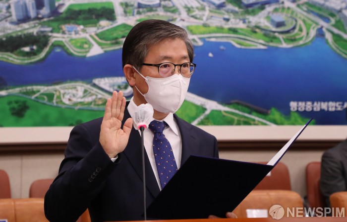 [서울=뉴스핌] 최상수 기자 = 23일 오전 국회에서 열린 변창흠 국토교통부 장관 후보자에 대한 인사청문회에서 변 후보자가 선서를 하고 있다. 2020.12.23 kilroy023@newspim.com