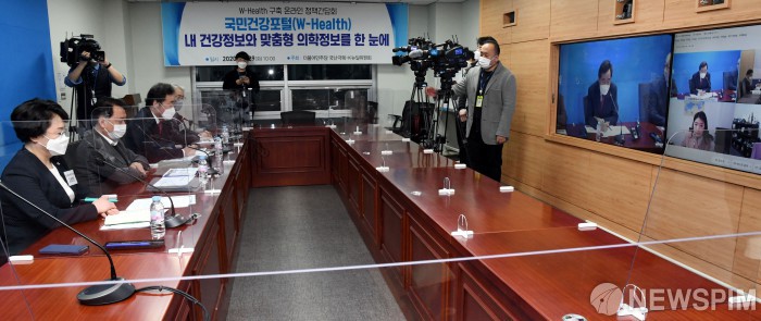 [서울=뉴스핌] 이형석 기자 = 29일 국회의원회관에서 열린 더불어민주당 국민건강 언텍트 간담회에서 참석자들이 화상간담회를 하고 있다. 2020.12.29 leehs@newspim.com