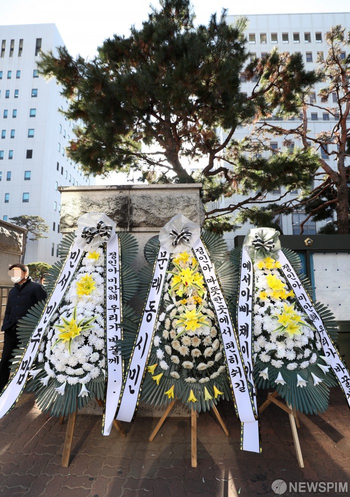[서울=뉴스핌] 정일구 기자 = 6일 오전 서울 양천구 서울남부지방법원 정문 앞에 양부모의 학대로 사망한 정인 양을 추모하는 근조화환이 놓여 있다. 정인 양의 양부모에 대한 첫 재판은 오는 13일 서울남부지법에서 열릴 예정이다. 2021.01.06 mironj19@newspim.com