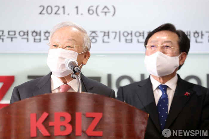 [서울=뉴스핌] 윤창빈 기자 = 손경식 한국경영자총협회 회장이 6일 오후 서울 여의도 중소기업중앙회에서 중대재해기업처벌법 제정에 대한 경제계 입장을 발표하고 있다. 2021.01.06 pangbin@newspim.com