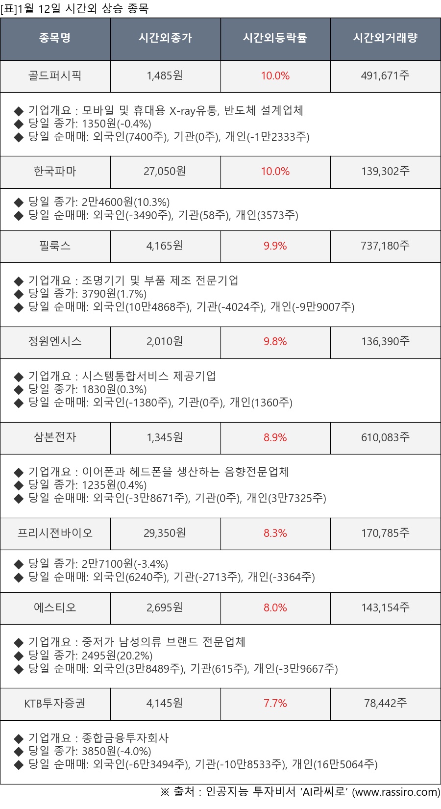[표]1월 12일 시간외 상승 종목 및 최근 동향