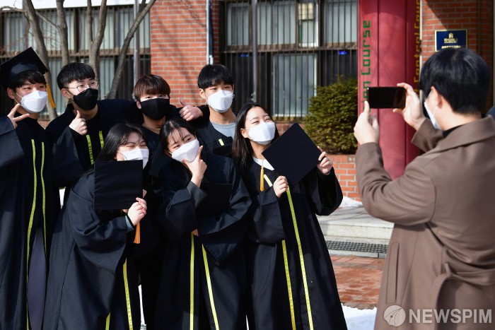 [서울=뉴스핌] 사진공동취재단 = 졸업식 시즌인 13일 서울 강남구 로봇고등학교에서 졸업한 3학년 학생들이 기념촬영을 하고 있다. 2021.01.13 photo@newspim.com