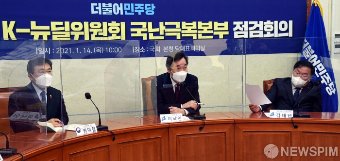 [서울=뉴스핌] 최상수 기자 = 14일 국회 더불어민주당 당대표실에서 열린 K-뉴딜위원회 국난극복 점검회의에서 이낙연 대표가 인사말을 하고 있다. 2021.01.14 kilroy023@newspim.com