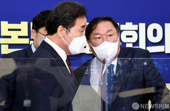 [서울=뉴스핌] 최상수 기자 = 14일 국회 더불어민주당 당대표실에서 열린 K-뉴딜위원회 국난극복 점검회의에 앞서 이낙연 대표와 김태년 원내대표가 대화를 나누고 있다. 2021.01.14 kilroy023@newspim.com