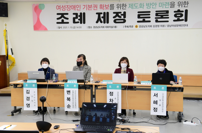 | 경남도의회 김경영 도의원(맨 왼쪽)이 15일 오후 도의회 대회의실에서 열린 여성장애인 기본권 확보를 위한 제도화 방안 마련을 위한 조례제정토론회에서 참석해 조례 제정의 필요성에 대해 설명하고 있다.[사진=경남도의회]2021.01.15 news2349@newspim.com |