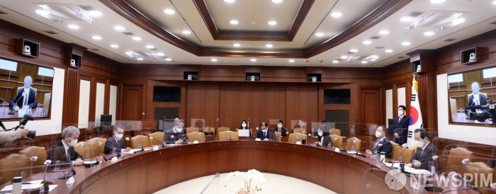 [서울=뉴스핌] 백인혁 기자 = 허재영 국가물관리위원회 민간위원장(왼쪽)이 18일 오후 서울 종로구 정부서울청사에서 열린 국가물관리위원회에서 모두발언을 하고 있다. 2021.01.18 dlsgur9757@newspim.com