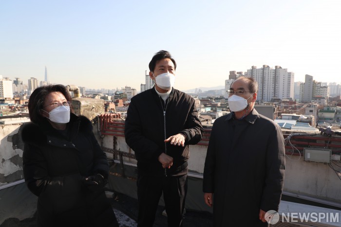[서울=뉴스핌] 국회사진취재단 = 서울시장 보궐선거에 출마한 국민의힘 오세훈 전 서울시장이 19일 오후 서울 성동구 성수전략정비구역 제4지구 재개발정비사업조합을 방문해 진수희 전 의원, 조합관계자와 성수동 일대의 재개발구역을 둘러보고 있다. 2021.01.19 photo@newspim.com