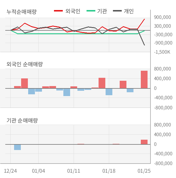 최근 5일동안 외국인은 84만 6646주 순매수 하고, 기관과 개인은 각각 14만 4703주 순매수, 111만 2867주 순매도 했다.