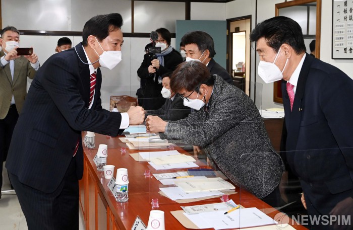 [서울=뉴스핌] 국회사진취재단 = 서울시장 보궐선거에 출마한 오세훈 전 서울시장이 27일 서울 송파구 교통회관에 위치한 서울용달연합총회를 방문해 업계 관계자와 주먹인사를 하고 있다. 2021.01.27 photo@newspim.com