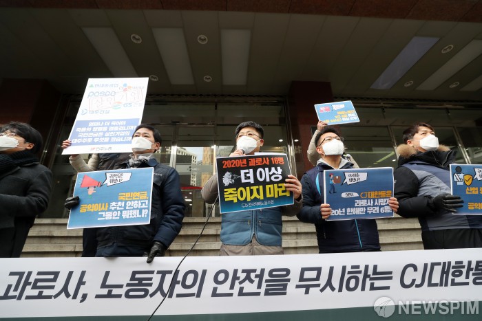[서울=뉴스핌] 정일구 기자 = 민주노총 공공운수노조 국민연금지부, 전국택배노조 등 관계자들이 27일 오후 서울 중구 CJ대한통운 본사 앞에서 중대재해발생기업에 대한 국민연금 주주권 행동 촉구 기자회견을 하고 있다. 2021.01.27 mironj19@newspim.com