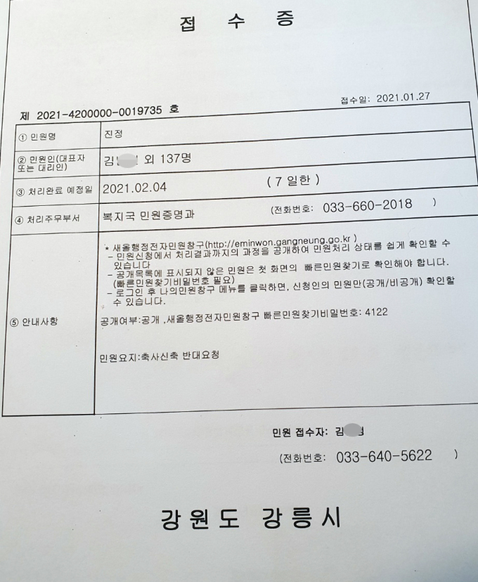 주민들은 "현재 마을 주변은 시민들의 새로운 안식처로서 신축주택도 여러 동 건축됐고 신축 예정인 것들도 있다"면서 "환경의 중요성과 보존보호가 점차 강조되고 환경오염으로부터 벗어나고자 하는 국민적 요청과 국가정책에 따라 강릉시에서도 최적의 주거환경으로 자리잡고 있는 지역의 축사 신축에 따른 건축허가를 반려해 달라"고 요구했다.