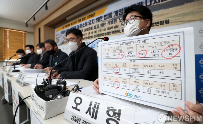[서울=뉴스핌] 정일구 기자 = 오세형 경제정의실천시민연합(경실련) 경제정책국 팀장이 1일 오전 서울 종로구 경실련 강당에서 열린 21대 국회의원 농지소유 현황 조사 발표 기자회견을 하고 있다. 2021.02.01 mironj19@newspim.com