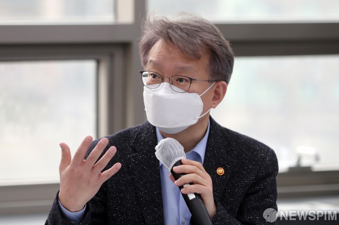 [서울=뉴스핌] 김학선 기자 = 권칠승 신임 중소벤처기업부 장관이 5일 마포구 드림스퀘어를 방문해 조봉환 소상공인시장진흥공단 이사장으로부터 버팀목자금 현황에 대해 설명을 들은 후 발언하고 있다. 2021.02.05 yooksa@newspim.com