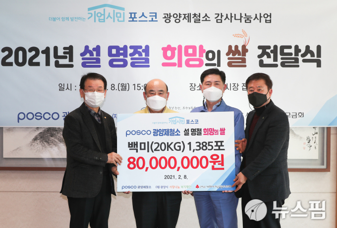 [광양=뉴스핌] 박우훈 기자 = 전남 광양시는 포스코 광양제철소에서 지역사회 이웃을 위해 8000만원 상당의 백미 20kg 1385포대를 (재)광양시사랑나눔복지재단에 기탁했다고 9일 밝혔다.