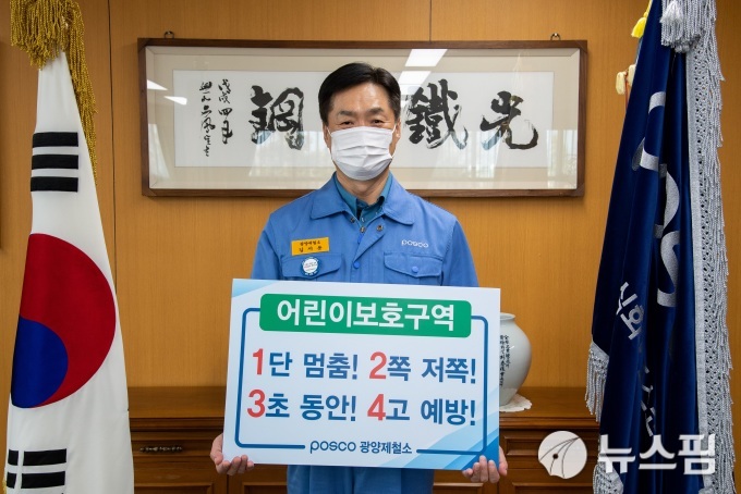 이날 김지용 광양제철소장과 이철호 광양제철소 행정부소장은 어린이 교통안전 구호인 '1단 멈춤! 2쪽 저쪽! 3초 동안! 4고 예방!'이란 팻말을 들고 어린이 보호 최우선 문화 정착과 어린이 교통안전의 중요성을 알렸다.