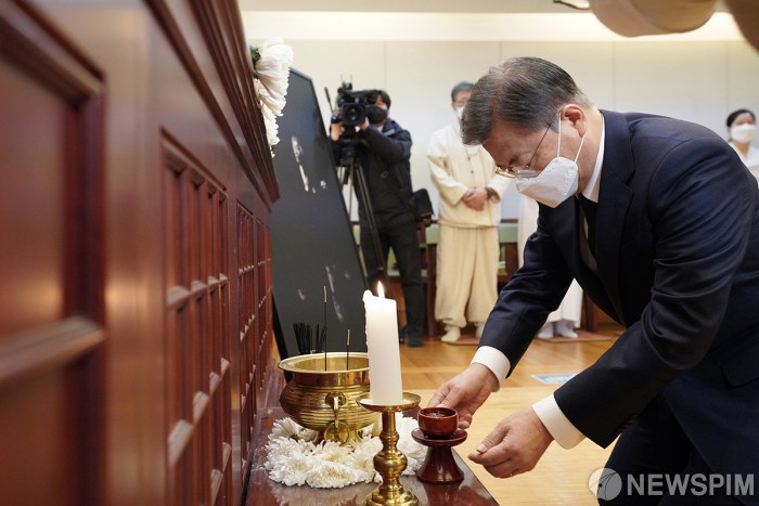 [서울=뉴스핌] 문재인 대통령이 17일 오전 서울 종로구 서울대병원 장례식장에 마련된 고(故) 백기완 통일문제연구소장 빈소를 조문하고 있다. [사진=청와대] 2021.2.17 photo@newspim.com