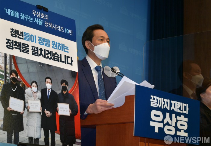 [서울=뉴스핌] 최상수 기자 = 더불어민주당 서울시장 경선후보인 우상호 의원이 18일 국회에서 청년 정책과 관련한 공약을 발표하고 있다. 2021.02.18 kilroy023@newspim.com