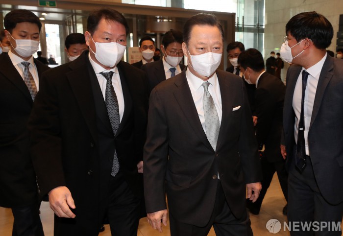 [서울=뉴스핌] 백인혁 기자 = 박용만 대한상공회의소 회장(오른쪽)과 최태원 SK그룹 회장이 23일 오전 서울 중구 대한상공회의소에서 열린 서울상의 정기의원총회에 참석하고 있다. 2021.02.23 dlsgur9757@newspim.com