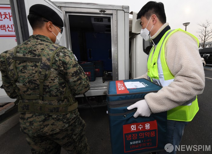 [수원=뉴스핌] 사진공동취재단 = 25일 오전 이천 지트리비앤티 물류센터에서 아스트라제네카 백신을 실은 운송 트럭이 경기 수원시 권선구 보건소에 도착했다. 이곳에 도착한 백신은 500명에게 접종할 수 있는 분량이다. 2021.02.25 photo@newspim.com