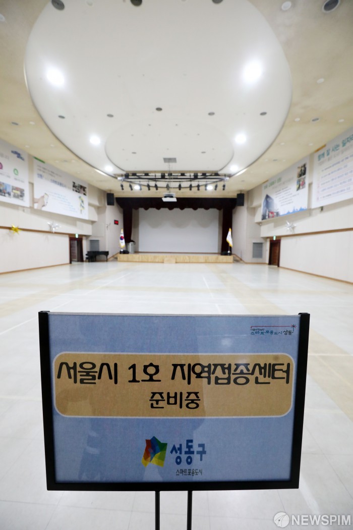 [서울=뉴스핌] 백인혁 기자 = 국내 첫 신종 코로나바이러스 감염증(코로나19) 백신 접종을 하루 앞둔 25일 오후 서울시 1호 지역접종센터인 서울 성동구 성동구청 대강당에 안내 푯말이 세워져 있다. 2021.02.25 dlsgur9757@newspim.com