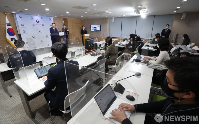 [서울=뉴스핌] 김학선 기자 = 정세균 국무총리가 25일 서울 종로구 정부서울청사에서 가진 첫 개방형 정례브리핑에서 취재진의 질문에 답하고 있다. 개방형 브리핑은 정부와 언론 간 소통 방식을 개선하기 위해 제안된 형식으로 총리실 출입기자뿐 아니라 모든 부처의 출입기자들을 대상으로 진행된다. 정부는 향후 이를 전 부처로 확대해 나간다는 방침이다. 2021.02.25 yooksa@newspim.com