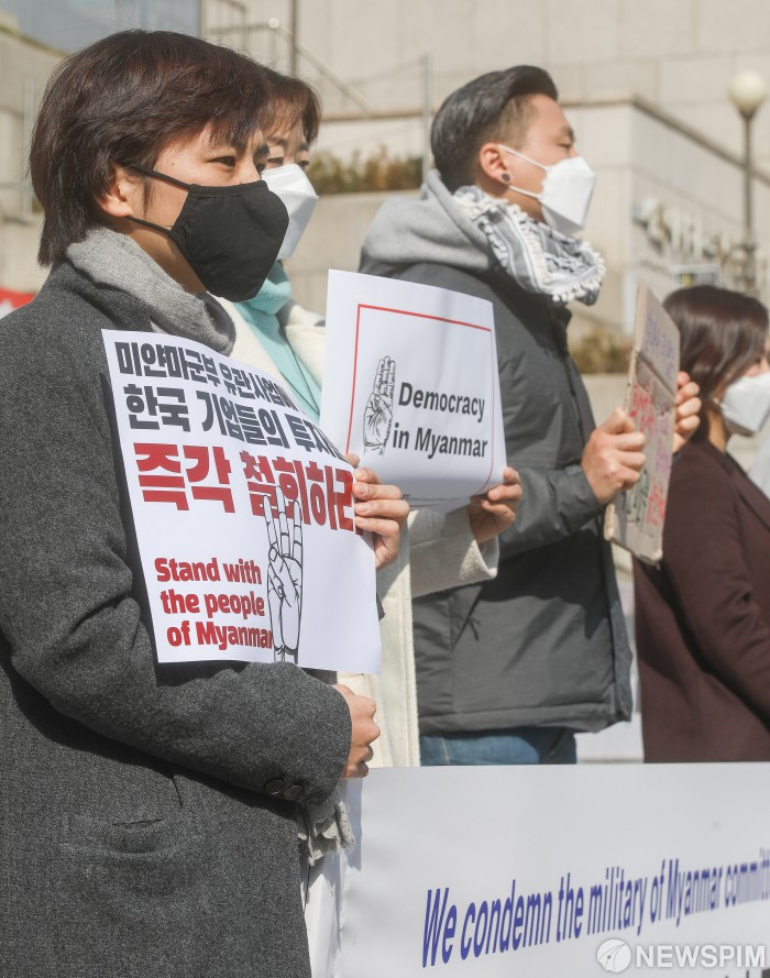 [서울=뉴스핌] 최상수 기자 = 미얀마의 민주주의를 지지하는 한국 시민사회단체모임이 3일 오전 서울 종로구 세종문화회관 앞에서 '피의 일요일' 자행한 미얀마 군부 규탄 및 한국의 책임있는 조치 촉구 기자회견을 열고 있다. 2021.03.03 kilroy023@newspim.com