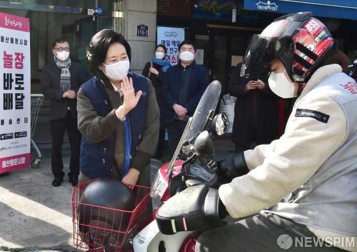 [서울=뉴스핌] 국회사진취재단 = 4.7 재보궐 선거에 출마를 선언한 박영선 더불어민주당 서울시장 후보가 3일 서울 용산구 용문전통시장을 방문, 장보기 서비스 주문 물품 전달 라이더에게 손을 흔들며 배웅하고 있다. 2021.03.03 photo@newspim.com