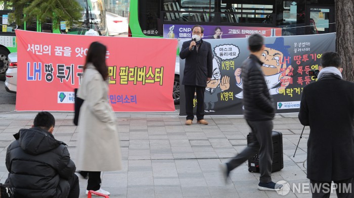 [서울=뉴스핌] 김학선 기자 = 16일 오전 서울 종로구 경복궁역 인근에서 폭정종식 비상시국연대와 국민의소리 주최로 LH 땅 투기 규탄 국민 필리버스터가 진행되고 있다. 2021.03.16 yooksa@newspim.com