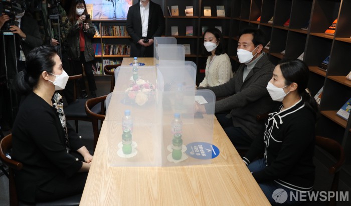 [서울=뉴스핌] 국회사진취재단 = 오세훈 국민의힘 서울시장 후보가 22일 오후 서울 서초4동 주민센터에서 공유어린이집 관계자들과 간담회를 하고 있다. 2021.03.22 photo@newspim.com