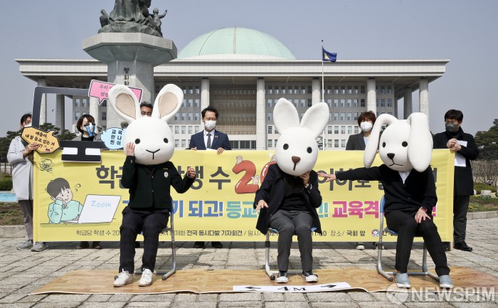 [서울=뉴스핌] 최상수 기자 = 23일 오전 서울 여의도 국회에서 열린 학급당 학생 수 20명 법제화 기자회견에서 참석자들이 학생 1인당 공간을 표현하는 퍼포먼스를 하고 있다. 2021.03.23 kilroy023@newspim.com