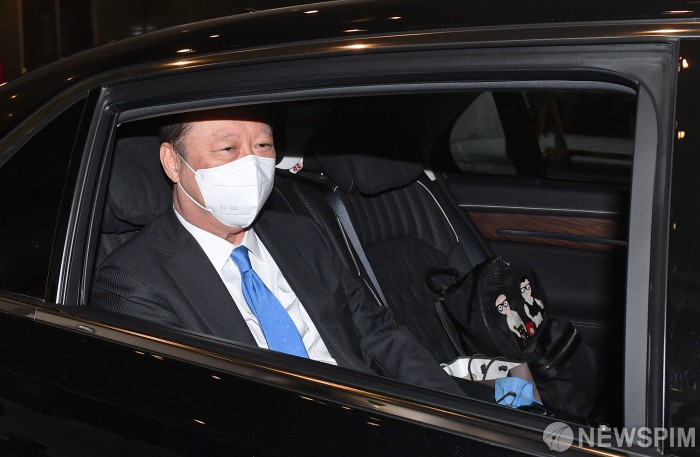 [서울=뉴스핌] 윤창빈 기자 = 박용만 전임 대한상의 회장이 24일 서울 남대문 상의회관에서 열린 대한상의 의원총회에 앞서 최태원 신임 회장을 비롯한 전국 상의회장단의 환송을 받으며 회관을 나서고 있다. 2021.03.24 pangbin@newspim.com