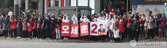 [서울=뉴스핌] 국회사진취재단 = 26일 오전 서울 양천구 신정네거리역 앞에서 열린 오세훈 국민의힘 서울시장 후보의 선거 유세에서 시민들과 지지자들이 오세훈 후보의 연설에 환호하고 있다. 2021.03.26 photo@newspim.com