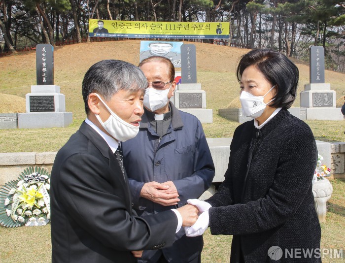 [서울=뉴스핌] 국회사진취재단 = 26일 효창공원에서 열린 안중근의사 111주년 추모식에 참석한 박영선 더불어민주당 서울시장 후보가 참석자들과 이야기를 나누고 있다. 2021.03.26 photo@newspim.com