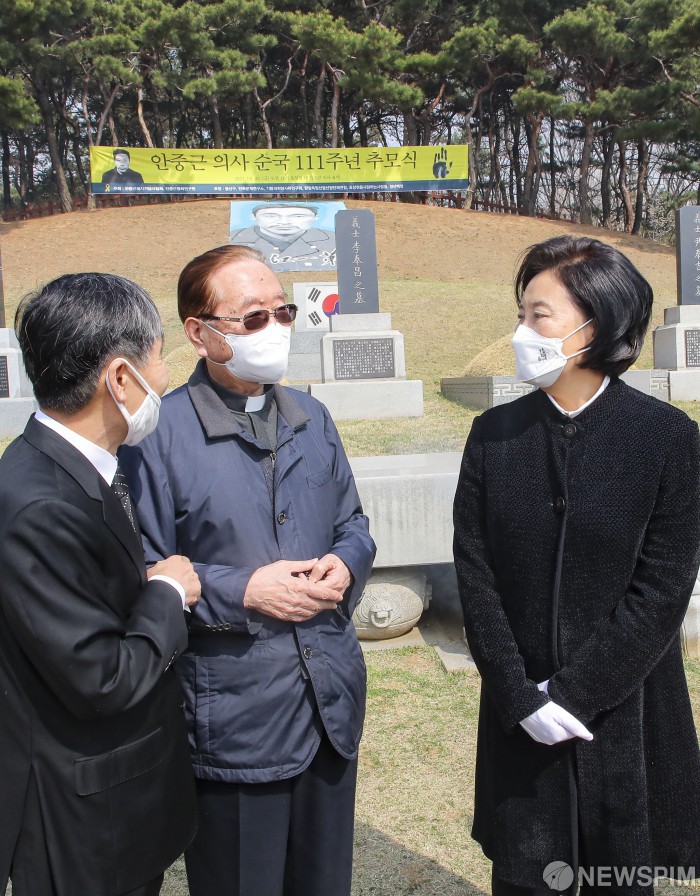 [서울=뉴스핌] 국회사진취재단 = 26일 효창공원에서 열린 안중근의사 111주년 추모식에 참석한 박영선 더불어민주당 서울시장 후보가 참석자들과 이야기를 나누고 있다. 2021.03.26 photo@newspim.com