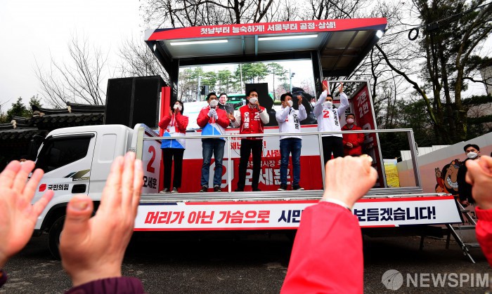[서울=뉴스핌] 국회사진취재단 = 국민의힘 오세훈 서울시장 후보가 28일 오후 서울 관악구 관악산 만남의 광장에서 시민들을 만나 지지를 호소하고 있다. 2021.03.28 photo@newspim.com