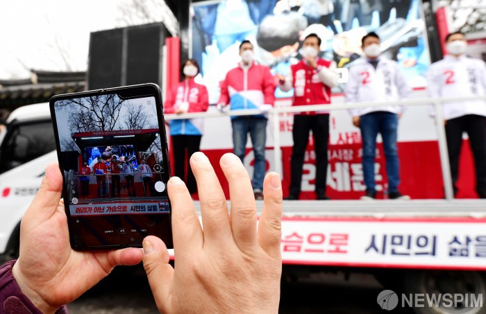 [서울=뉴스핌] 국회사진취재단 = 국민의힘 오세훈 서울시장 후보가 28일 오후 서울 관악구 관악산 만남의 광장에서 시민들을 만나 지지를 호소하고 있다. 2021.03.28 photo@newspim.com