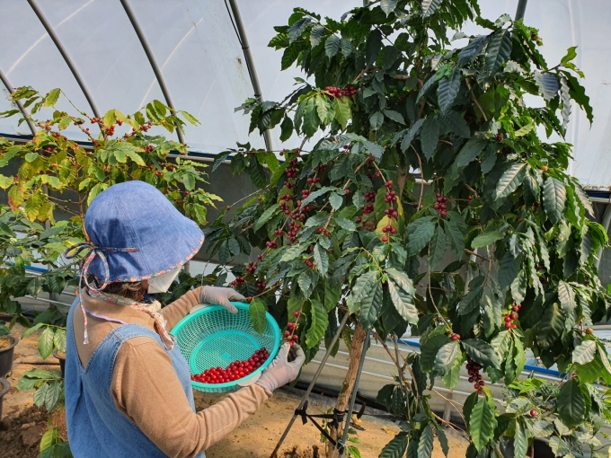 이 중 들꽃마을농장(모동면 금천리 소재) 시설하우스에서 최근 일부 품종은 꽃을 피웠고, 다른 품종은 커피 열매가 붉게 익어 수확하고 있다.