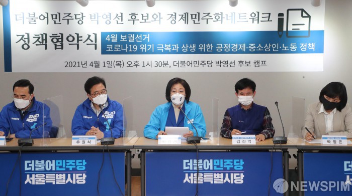 [서울=뉴스핌] 최상수 기자 = 더불어민주당 박영선 서울시장 후보가 1일 오후 서울 여의도 더불어민주당 서울시당사에서 열린 경제민주화네트워크 정책협약식에서 발언을 하고 있다. 2021.04.01 kilroy023@newspim.com