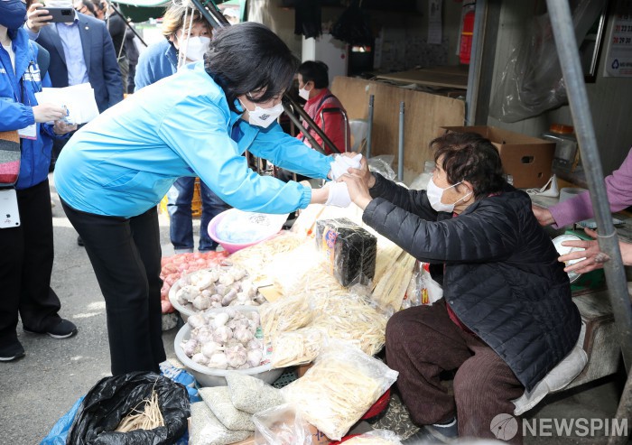 [서울=뉴스핌] 국회사진취재단 = 박영선 더불어민주당 서울시장 후보가 1일 오후 서울 영등포구 우리시장을 찾아 상인과 인사를 하고 있다. 2021.04.01 photo@newspim.com