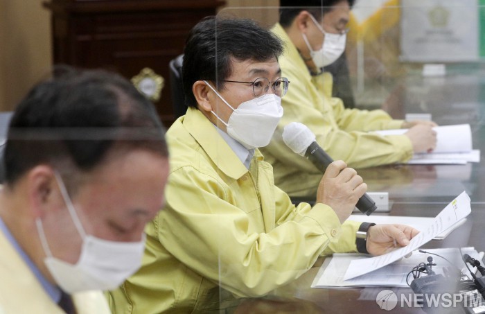 [서울=뉴스핌] 정일구 기자 = 권덕철 보건복지부 장관이 2일 오전 서울 마포구 마포구의회 회의장에서 열린 보건의료단체장 코로나19 백신접종 간담회에서 인사말을 하고 있다. 2021.04.02 mironj19@newspim.com