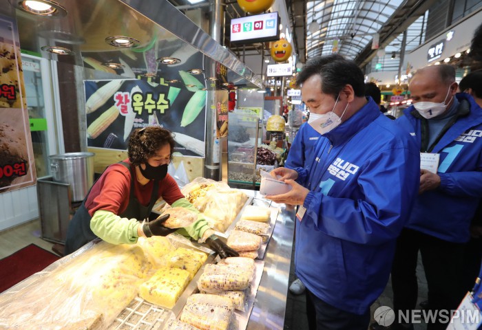 [서울=뉴스핌] 최상수 기자 = 이낙연 더불어민주당 상임선대위원장이 서울 도봉구 방학동 도깨비 시장에서 박영선 서울시장 후보 지원 유세를 하고 있다. 2021.04.04 kilroy023@newspim.com