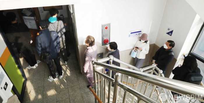 [서울=뉴스핌] 백인혁 기자 = 서울시장 보궐선거일인 7일 오전 서울 동작구 사당종합사회복지관에 마련된 사당 제4동 제4투표소에서 시민들이 투표에 앞서 줄을 서고 있다. 2021.04.07 dlsgur9757@newspim.com