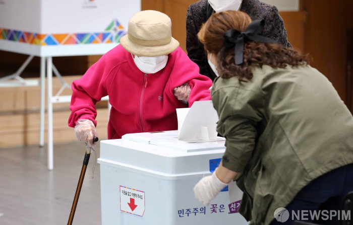 [서울=뉴스핌] 백인혁 기자 = 서울시장 보궐선거일인 7일 오전 서울 동작구 사당종합사회복지관에 마련된 사당 제4동 제4투표소에서 한 할머니가 투표를 하고 있다. 2021.04.07 dlsgur9757@newspim.com