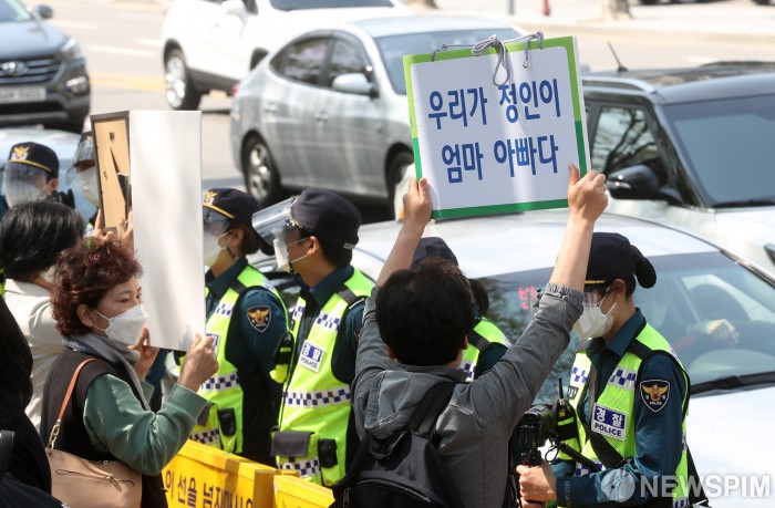 [서울=뉴스핌] 정일구 기자 = 양부모에게 학대를 당해 숨진 16개월 영아 '정인이 사건'의 5차 공판이 열린 7일 오후 서울 양천구 서울남부지방법원 앞에서 시민들이 살인죄 처벌 촉구 피켓 시위를 하고 있다. 2021.04.07 mironj19@newspim.com