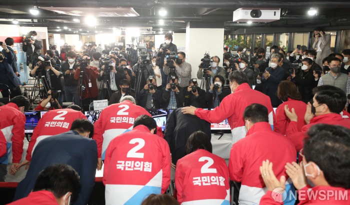 [서울=뉴스핌] 최상수 기자 = 김종인 국민의힘 비대위원장과 오세훈 서울시장 후보가 7일 서울 여의도 중앙당사에 마련된 상황실에서 4·7 재보궐선거 방송사 출구조사 발표를 확인 후 인사하고 있다. 2021.04.07 kilroy023@newspim.com