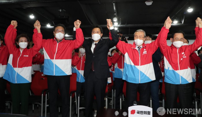 [서울=뉴스핌] 국회사진취재단 = 오세훈 국민의힘 서울시장 후보와 김종인 비상대책위원장등이 7일 오후 서울 여의도 국민의힘 중앙당사에 마련된 개표상황실에서 출구조사 결과를 보며 환호하고 있다. 2021.04.07 photo@newspim.com