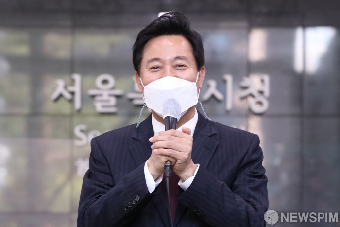 [서울=뉴스핌] 윤창빈 기자 = 제38대 서울특별시장에 당선된 오세훈 시장이 8일 오전 서울특별시청으로 출근하며 소감을 밝히고 있다. 2021.04.08 pangbin@newspim.com