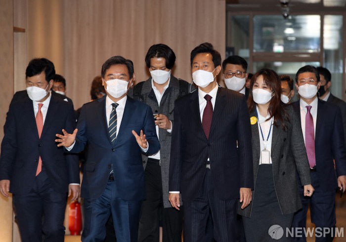 [서울=뉴스핌] 사진공동취재단 = 오세훈 서울시장이 8일 오전 서울시청으로 출근해 집무실로 향하고 있다. 2021.04.08 photo@newspim.com