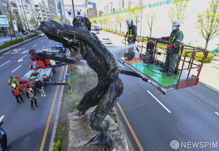 [서울=뉴스핌] 백인혁 기자 = 8일 오전 서울 송파구 올림픽로에서 송파구청 관계자들이 중앙분리대에 설치된 올림픽 상징 조형물을 고압세척기를 이용해 세척하고 있다. 2021.04.08 dlsgur9757@newspim.com